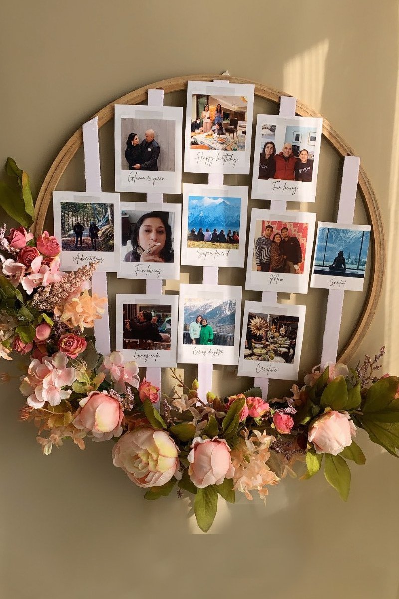 A captivating blend of photos and florals. This innovative product features a wooden ring adorned with your cherished photos and surrounded by delicate blooms.